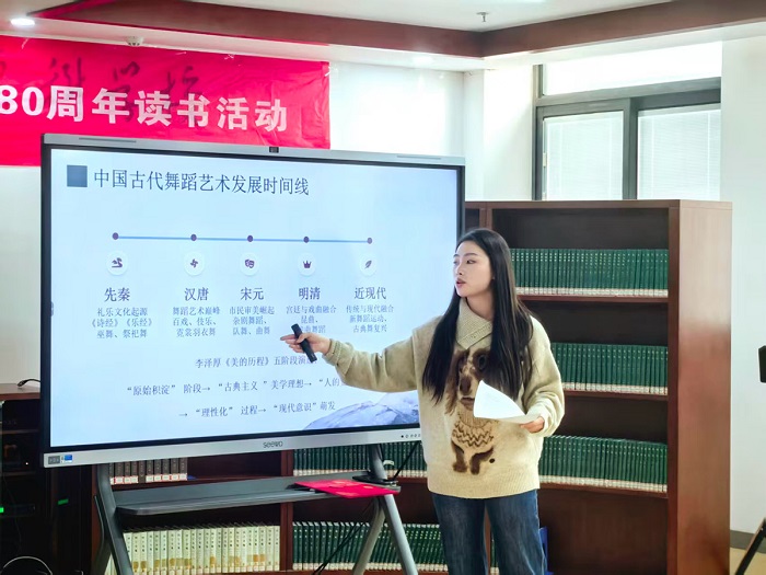 12月11日,我校“悦读经典”读书会第二十五期分享活动在图书馆文学欣赏室顺利举行。本期活动聚焦李泽厚先生的经典美学著作《美的历程》,特邀主讲人通过中国古代舞蹈艺术这一独特视角,引领师生进行了一场跨越时空的美学对话。丹阳师范学院副院长高飞燕、现教中心副主任束锁平及师生代表参与了本次活动。